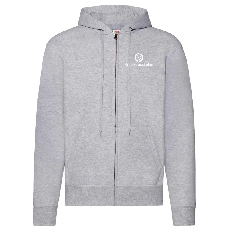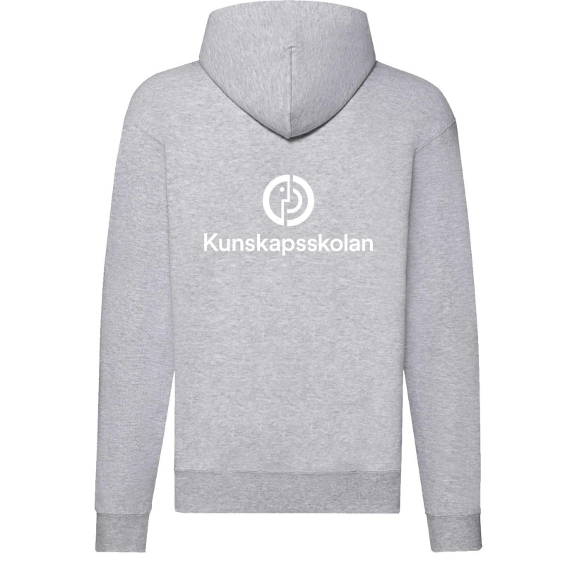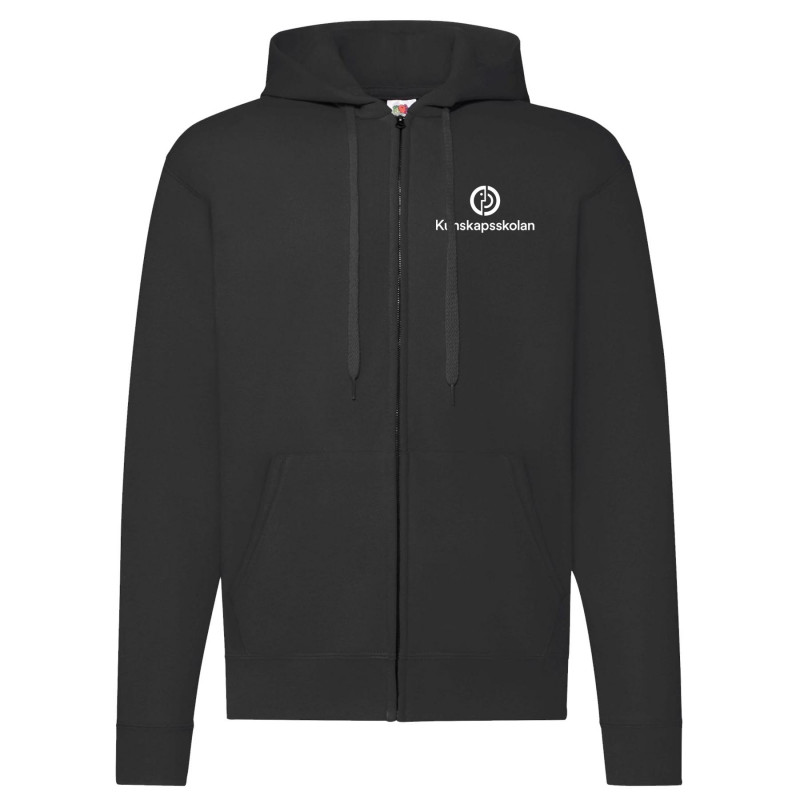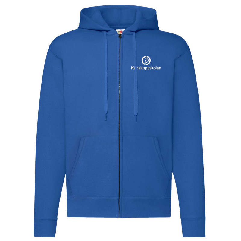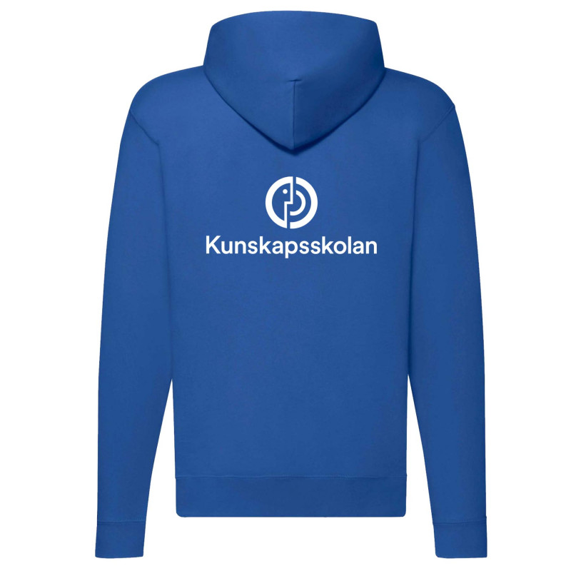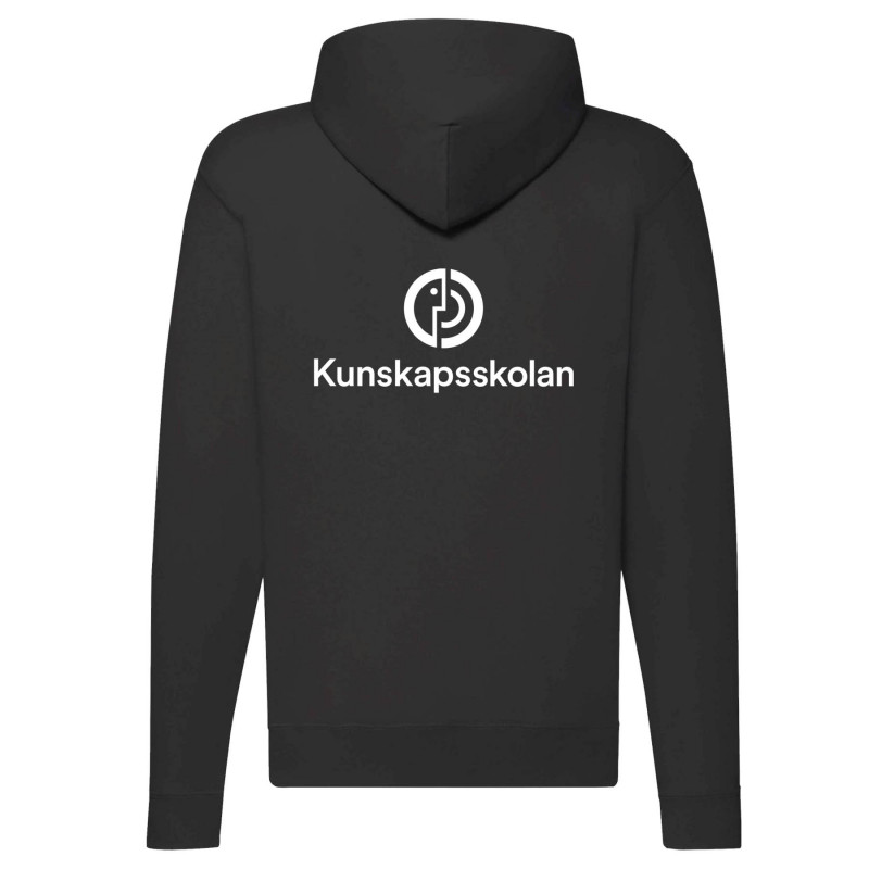 Fruit of the Loom Material: 80% bomull och 20% polyester Mjuk och skön jacka med dragkedja. Dubbelsydd huva och fickor framtill. Flossad insida. OBS! Barntröjan har inte snoddar som vuxentröjan har.TRYCK:Du kan välja att antingen få skolans logga tryckt litet på vänster bröst eller stort på ryggen. Trycket är vitt. Du kan även välja till och få ditt namn...