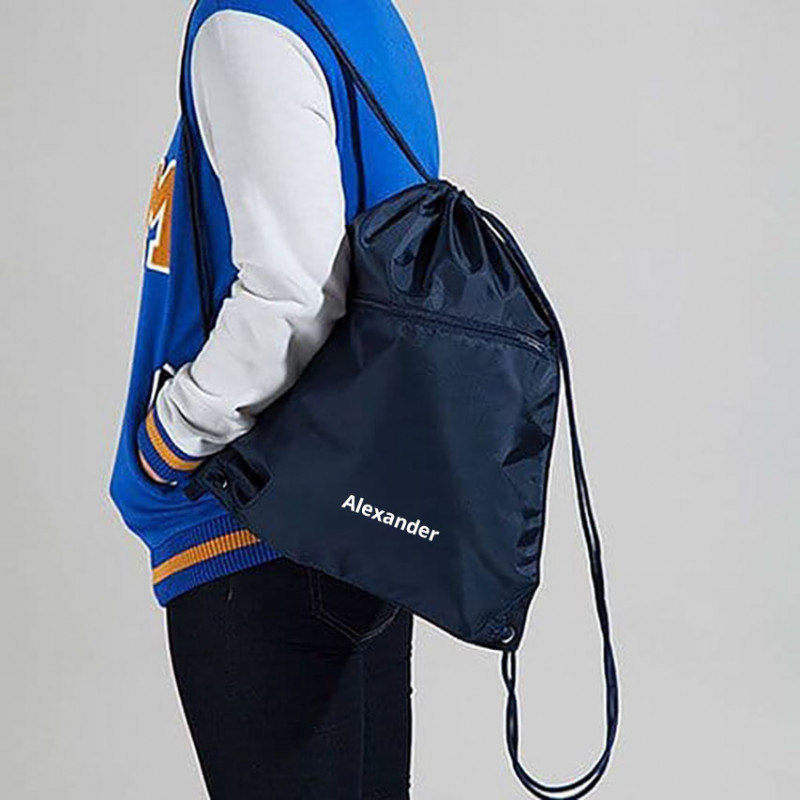 Tryck av skolans logga mitt på gympapåsen ingår. Du kan också välja till och få ditt eget namn tryckt litet under loggan eller litet nertill på baksidan av påsen. Trycket är vitt.
